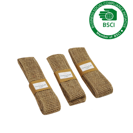 Een decoratief lint van natuurlijk jute, 5 cm breed en 3 meter lang, perfect voor bruiloften.