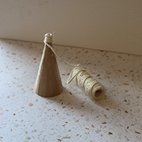 4Begin bovenaan bij de punt van de kartonnen kegel met het jute touw en draai het touw om de kegel heen  (zie foto 2).