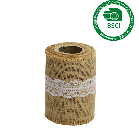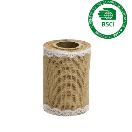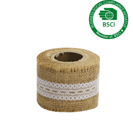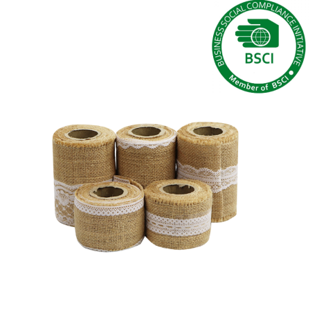 Het Jute lint met kant combineert de natuurlijke uitstraling van jute met elegante kantdetails, ideaal voor cadeauverpakkingen, bruiloften, feestdecoraties en creatieve projecten. Stevig, duurzaam en stijlvol, geeft dit lint een rustieke en romantische touch aan elk project en past het bij diverse interieur- en decoratiestijlen.