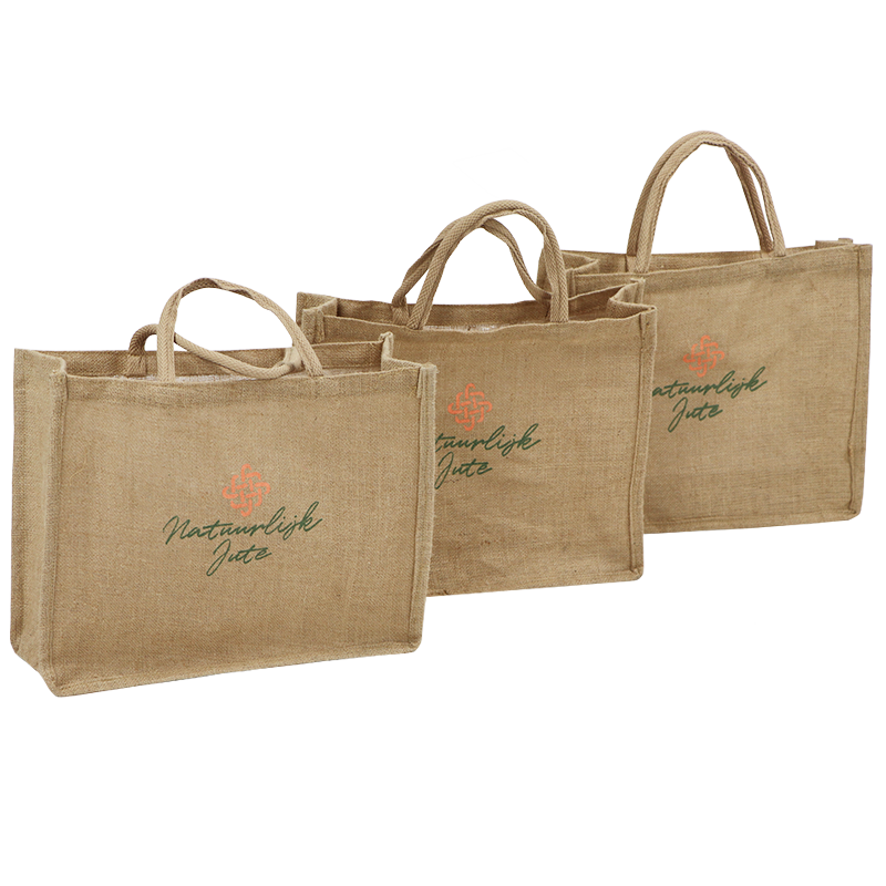 Een stevige en milieuvriendelijke draagtas van ongekleurd, natuurlijk jute met een formaat van 40 cm breed en 33 cm hoog.
