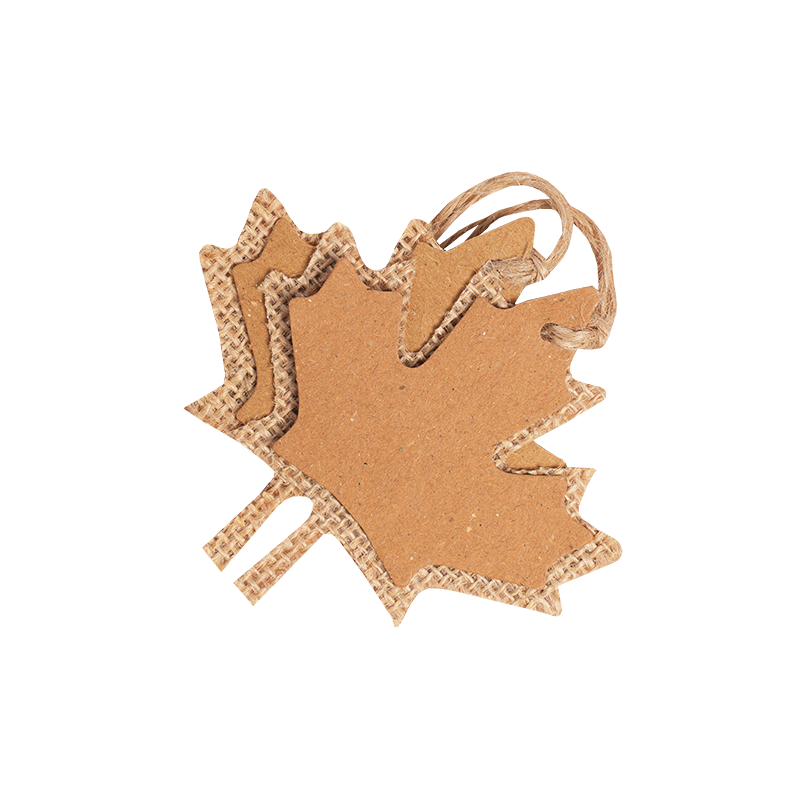 Labels van natuurlijk jute in de vorm van een esdoornblad, ideaal voor decoratie en creatieve toepassingen.