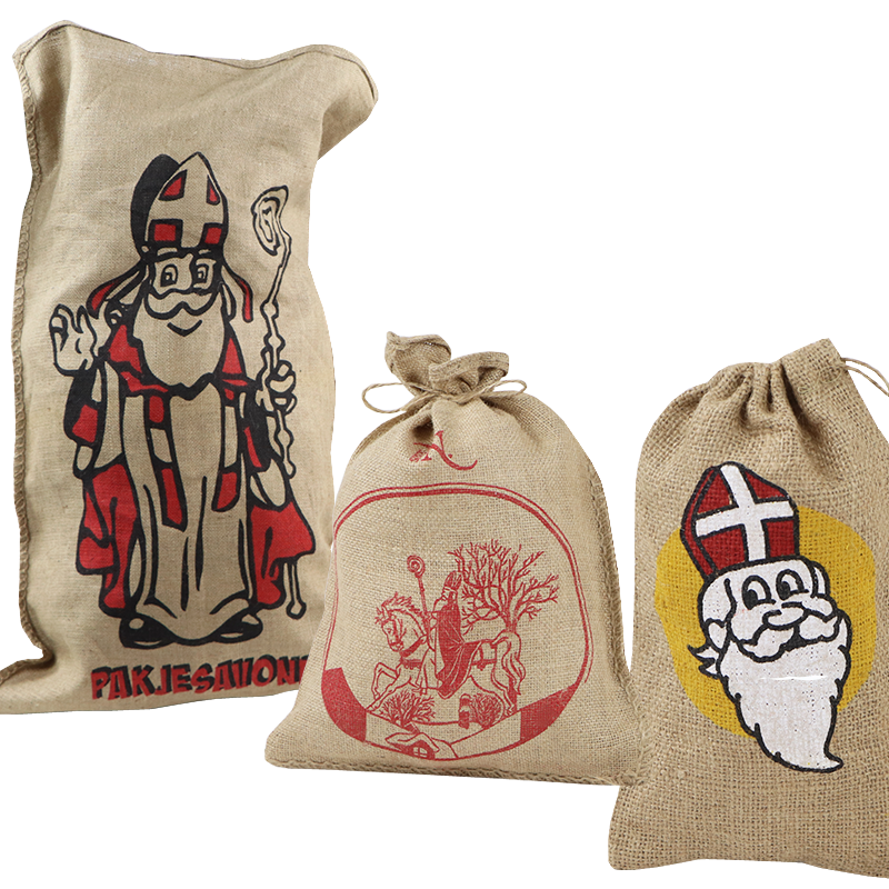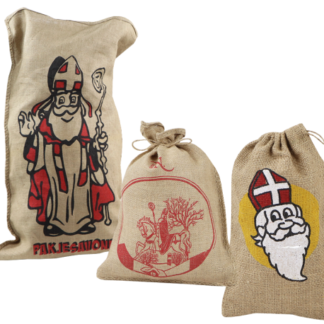 Dit zijn stevige jute zakken bedrukt of onbedrukt, speciaal voor Sinterklaascadeaus en surprises.