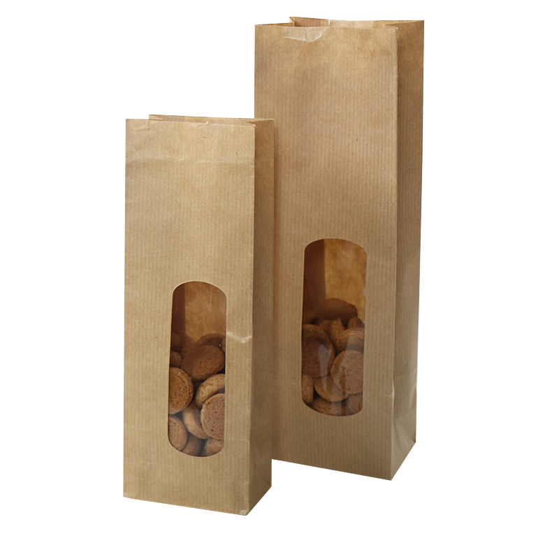 Papieren zakjes met een blokbodem van 7 cm breed en 20 cm hoog, ideaal voor het verpakken van kleine producten of geschenken.