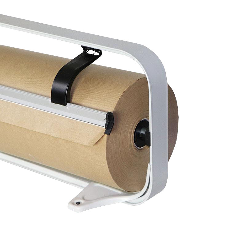 Het is een stevige houder voor papier- of folierollen die op tafel geplaatst wordt. Het kartelmes maakt het eenvoudig om papier of folie op maat af te snijden.