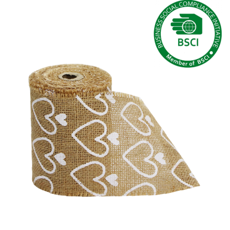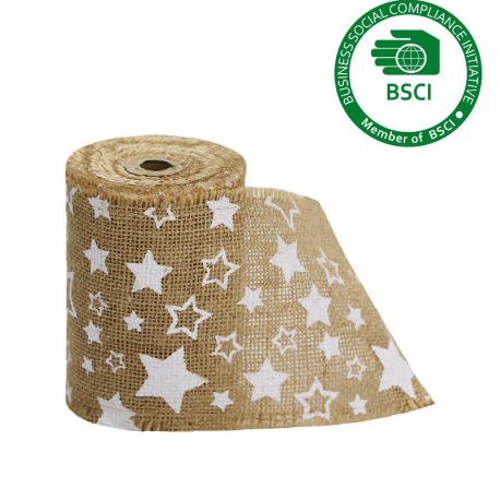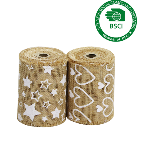 Een rol tafelloper van 10 cm breed en 5 meter lang, gemaakt van jute en voorzien van een decoratieve bedrukking.