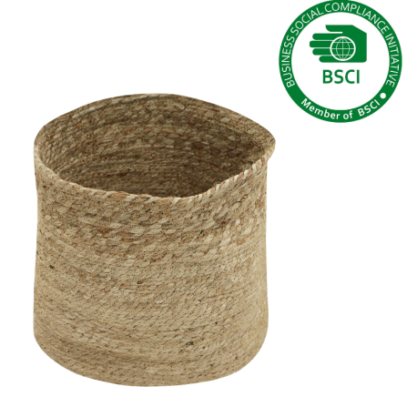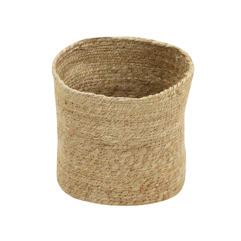 Een middelgrote mand van natuurlijk jute, 20 cm breed en 20 cm hoog, ideaal voor opbergen en decoratie.
